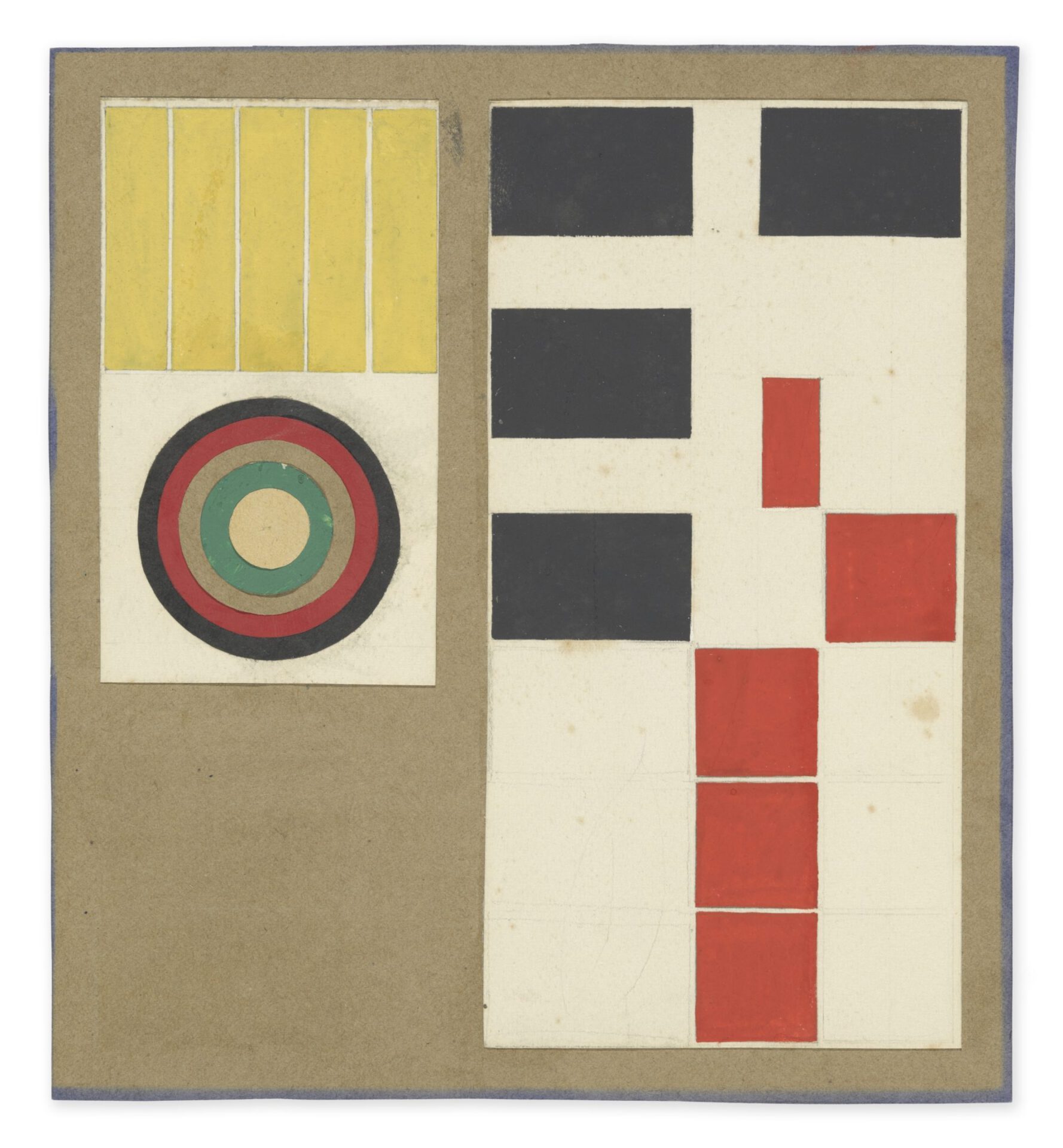 Für die »Compositions statiques« nutzte Sophie Taeuber-Arp verschiedene Materialien: Angefangen bei den noch mit Hand skizzierten Zeichnungen, über die mit Zirkel und Lineal vorkonstruierten Gouachen auf Papier, bis hin zur ebenso vorgezeichneten Ölmalerei auf Leinwand werden alle Medien bedient. Doch nicht nur zweidimensionale Werke entstanden nach diesem Schema: In den späten 1930er-Jahren entwarf Taeuber-Arp auch Reliefs, bei denen sich Fläche und Formen voneinander abheben. [Laura Hillers]